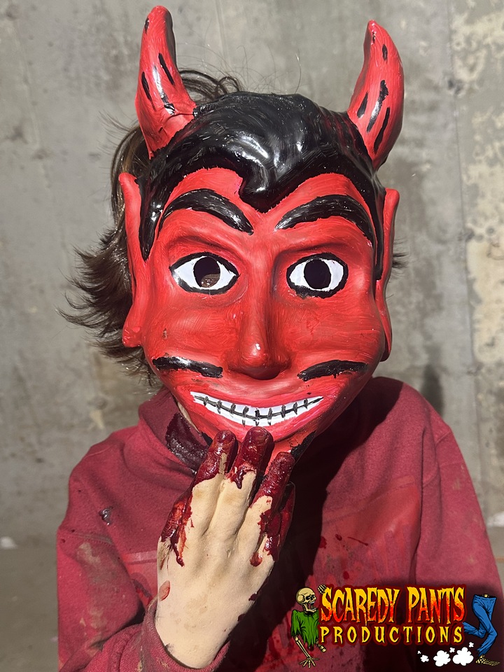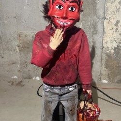 At rest, the figure appears to be a rough-around-the-edges kid dressed for Halloween. His costume feels thrown together—worn clothing, scuffed shoes, and a cheap, vintage-style plastic mask reminiscent of 1980s trick-or-treat culture. The mask itself is slightly oversized, with faded paint and a hollow expression, giving it an eerie charm that draws guests closer rather than pushing them away.