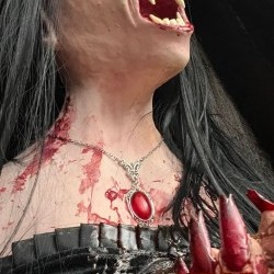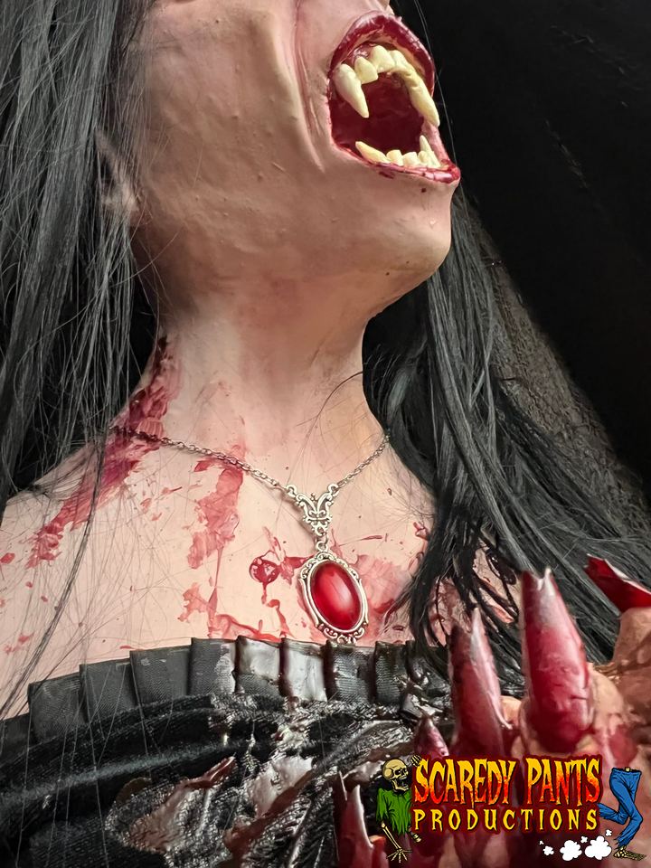 Design Overview: The animatronic vampire bride stands gracefully at about 5'-6" tall, exuding a haunting elegance. She is adorned in a flowing, black dress that blends shades of deep silky black, giving her a timeless, Gothic appearance. Her pale skin contrasts sharply with dark, dramatic makeup, featuring striking red lips and black eyes that enhance her alluring yet eerie presence. Her figure nails, eye lashes and teeth are individually applied.